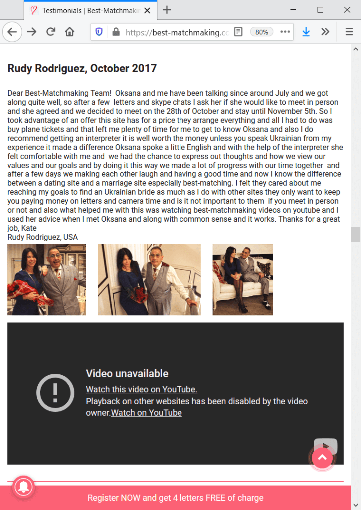 But Rudy makes the most revieling statement when he talks about the woman he met. He calls her Natalia (4:00). On sitejabber, as well as the identical testimonial on Best-Matchmaking’s website, Rudy calls her Oksana. Is this the reason why Kate (the owner of Best-Matchmaking and the concerning video’s YouTube channel Ukraine brides) does not allow to run the video directly below Rudy’s written words? You have to open the video seperately: